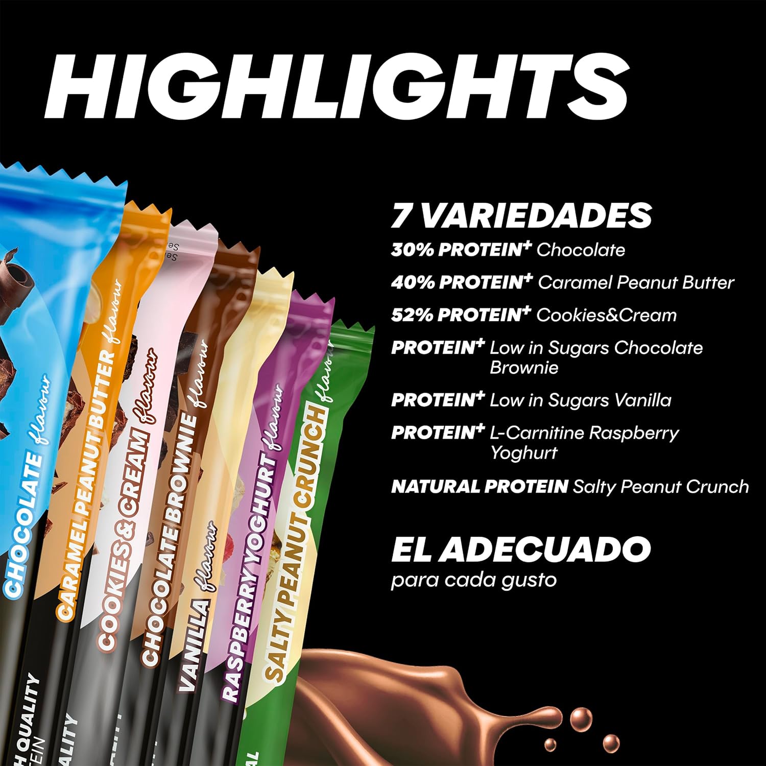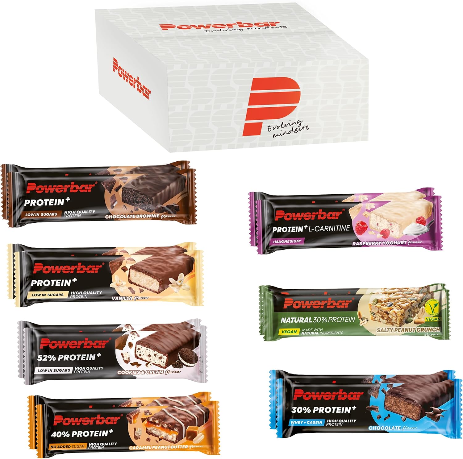 NOW IN THE PROTEIN MIXBOX with 14 bars, 2 of each flavor: Chocolate, Caramel Peanut Butter, Cookies & Cream, Chocolate Brownie, Vanilla, Raspberry-Yoghurt and Salty Peanut Crunch