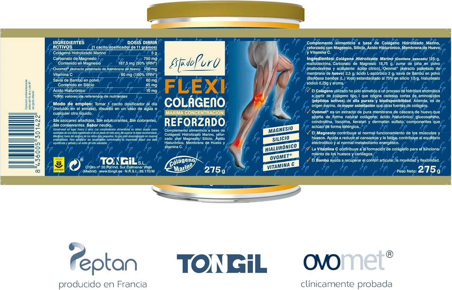 Joint comfort, firmness and vitality : FLEXI COLLAGEN PURE STATE combines key ingredients to improve mobility, flexibility and comfort of your joints, while strengthening bones, skin, hair and nails. With 5000mg of Clinically Backed Hydrolyzed Marine Collagen Peptan works from within to restore connective tissues and sustain your structural and aesthetic well-being.