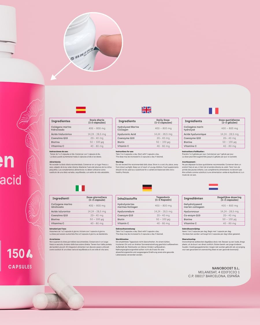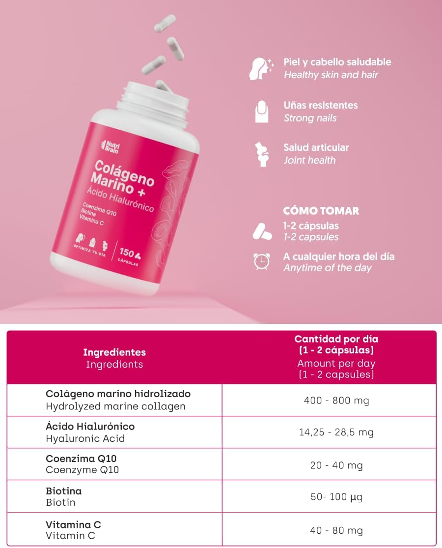 Nuestra fórmula combina colágeno marino tipo I, ácido hialurónico, Coenzima Q10, biotina y vitamina C, lo que ayuda a nutrir piel, articulaciones, huesos, cabello y uñas desde dentro.
