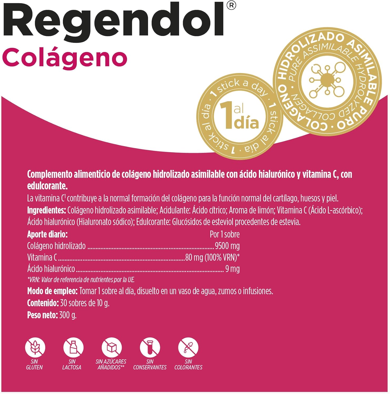 POWERFUL ANTIOXIDANT FOR SKIN: Our Regendol Collagen provides 10 grams of collagen and is reinforced with hyaluronic acid and the recommended daily amount of vitamin C. This nutrient has dual function: stimulating collagen production and providing an antioxidant effect. As a result, it contributes to preventing premature aging and reducing the effects of oxidative stress.