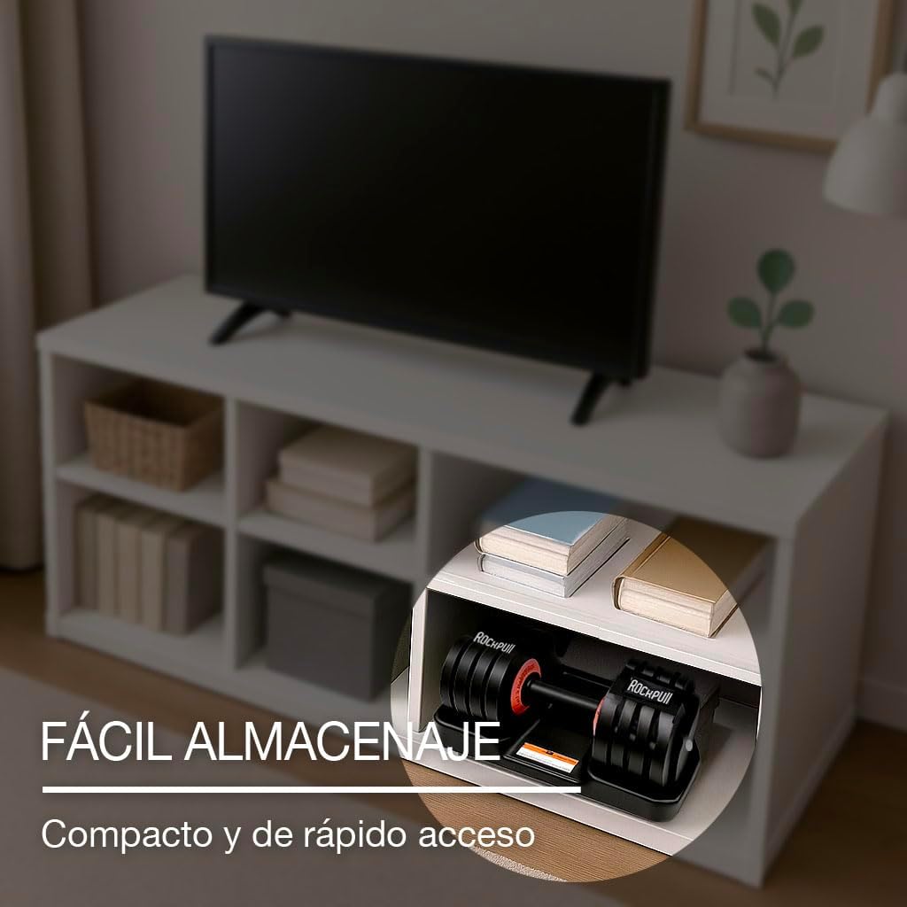 Olvídate de tener el suelo lleno de pesas diferentes. Con esta mancuerna ajustable Rockpull, ahorras espacio, tiempo y dinero al sustituir hasta 5 mancuernas convencionales en un solo equipo inteligente, compacto y ultra funcional. Es ideal para quienes entrenan en casa y valoran el orden, la eficiencia y el progreso constante.