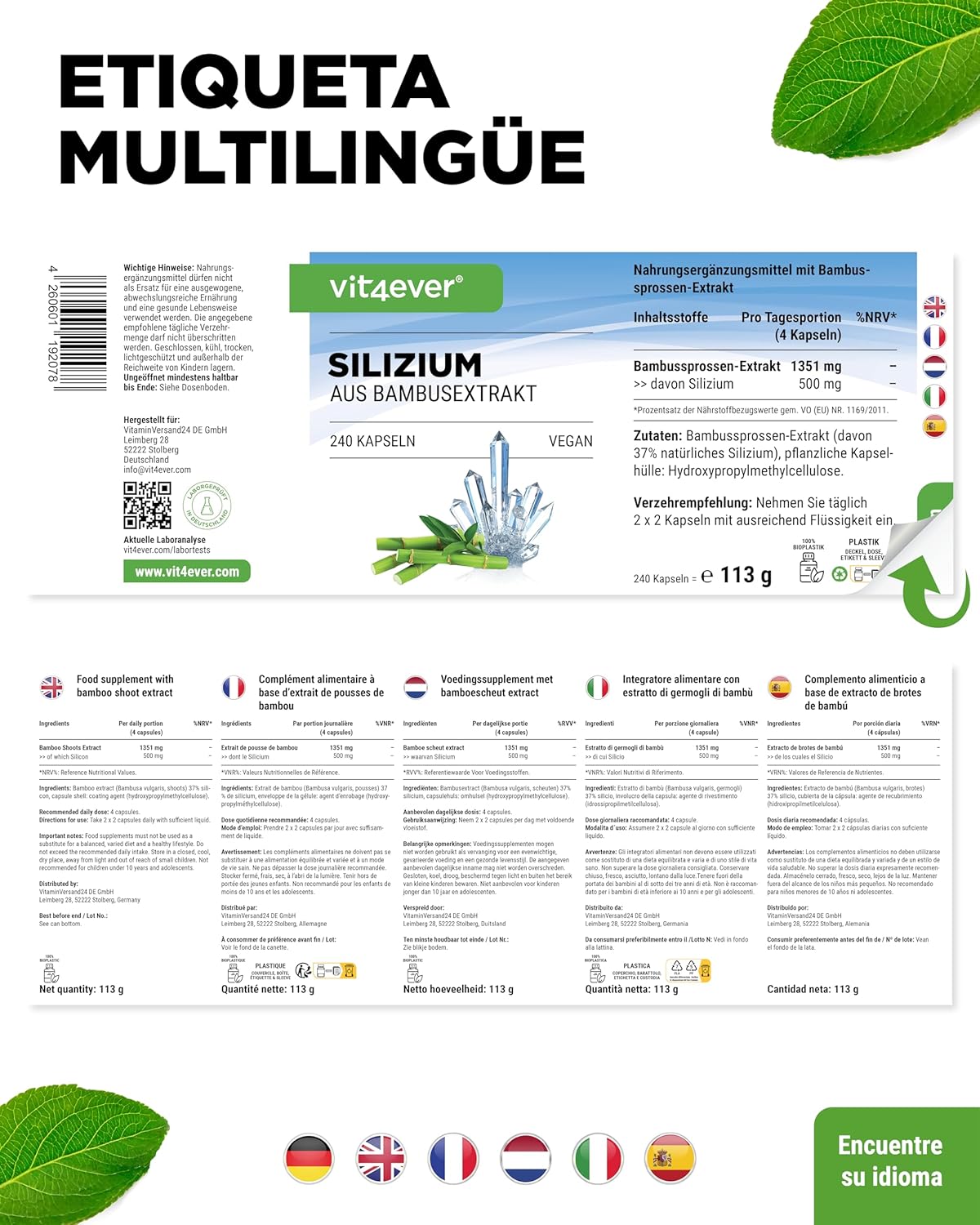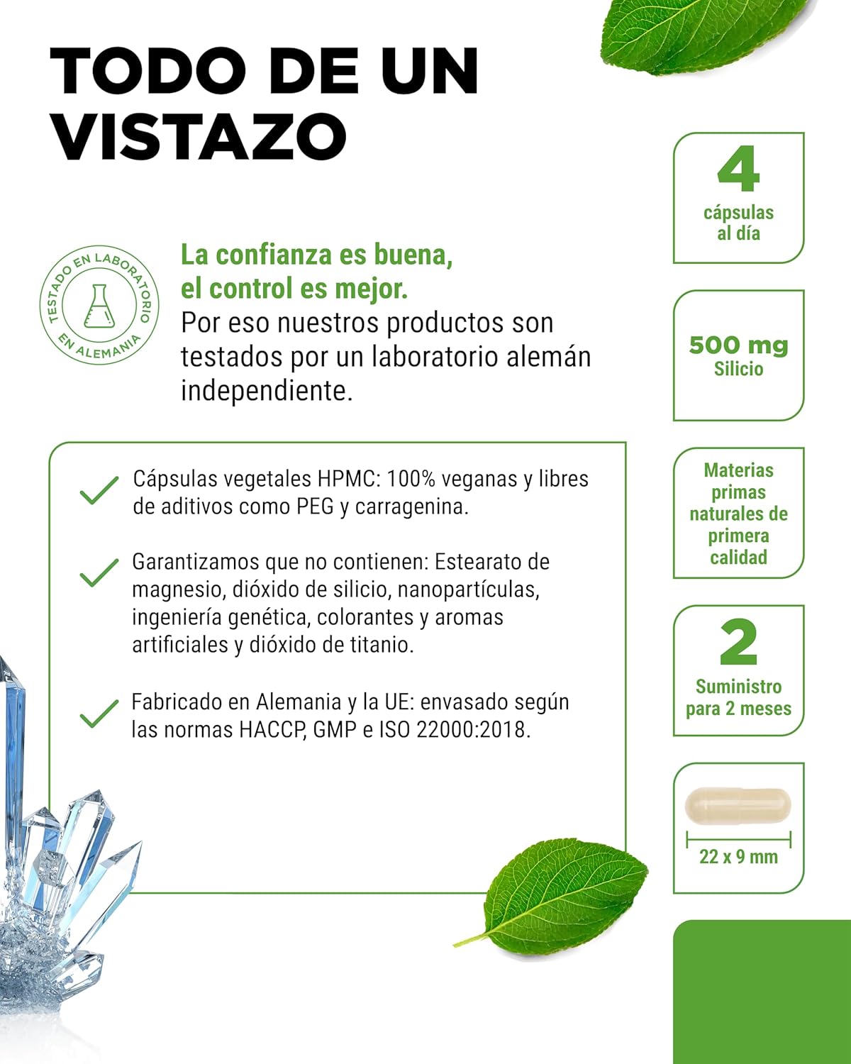 HIGH DOSE AND PRACTICAL 2 MONTH SUPPLY: 240 vegan capsules per pack with 500 mg of bamboo sprout extract per daily dose (4 capsules). Each dose provides 185 mg of pure silicon, the ideal dose for a specific supplement for 60 days.