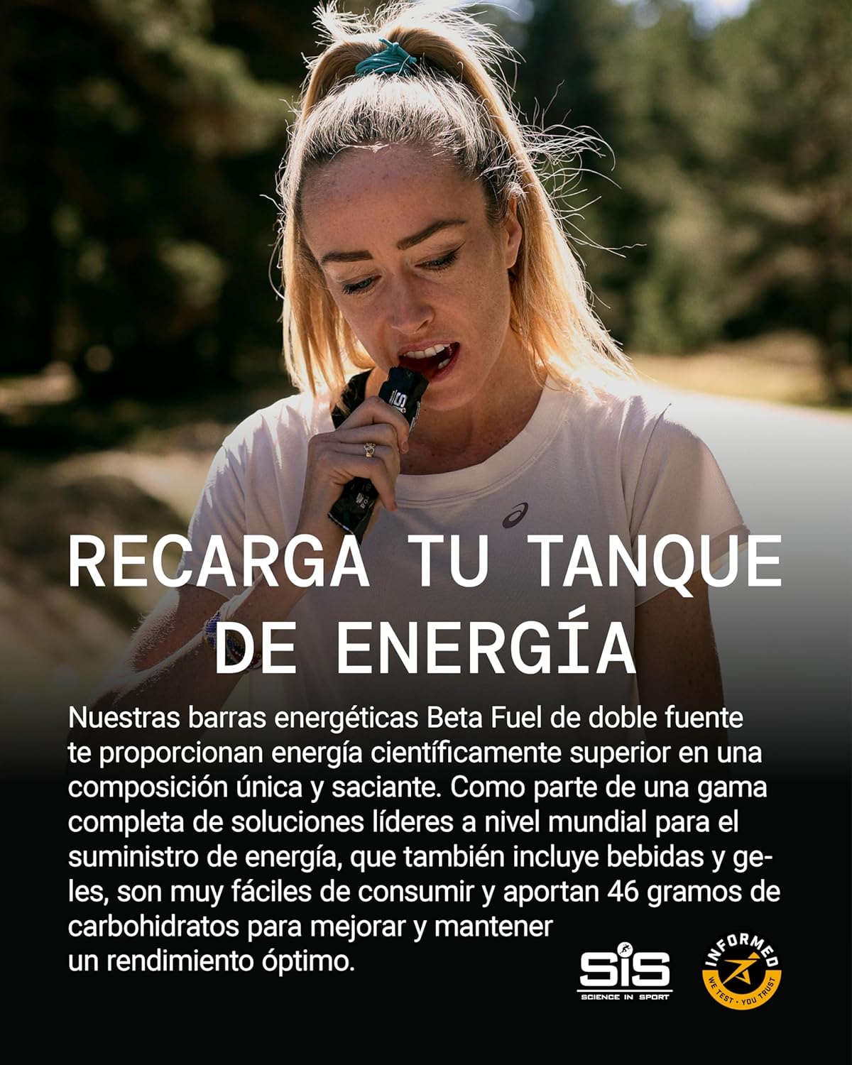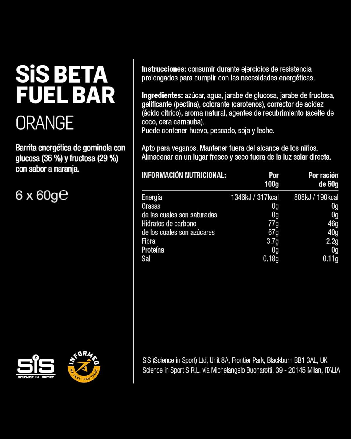 Science in Sport Energy Bars are made with an enhanced Beta compound to provide you with the ideal fuel for the most demanding physical exercise. Bars are part of a range of industry-leading sports solutions that are complemented by gels and drinks. Each bar is easy to carry and eat so you can continue your sports routine without stopping. An athlete who exercises for periods of more than two hours needs an intake of between 80 and 120 grams of carbohydrates. SiS bars are a Beta source that provides you with 46 grams of carbs instantly with an innovative new ratio that gives you an increase in energy and increase carb efficiency without giving you intestinal discomfort. It is recommended to use 1 to 3 bars per hour of exercise for optimal performance. The science behind Beta fuel has evolved thanks to research from our team and working closely with high-performance athletes. This is how we have achieved some Beta bars where the new ratio 1:0.8 replaces the old 2:1. The 1:08 ratio of maltodextrin to fructose is scientifically higher, increases efficiency from 62% to 74%, improves exogenous CHO oxidation by 17%, increases average workout power by 3%, and reduces symptoms of feeling full or nausea during exercise. The bars also have a certification for sports accessories. Ingredients Suitable for vegans, the bars are made with sugar, water, glucose syrup, fructose syrup, gelling agent (pectin), flavoring, acidity regulator (citric acid), corn starch, icing agent (coconut oil, carnauba wax), dye (turmeric extract). May contain eggs, fish, soybeans, milk and cereal containing gluten.