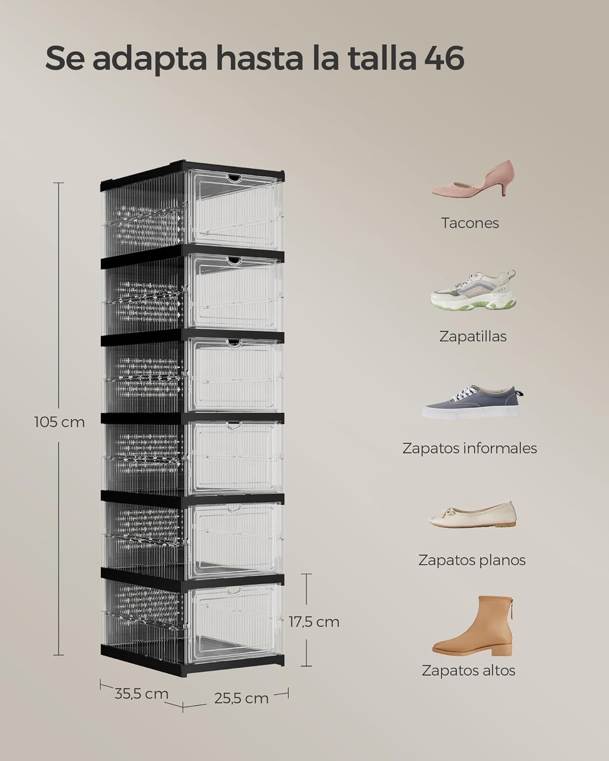 Color: Transparente, Negro TintaMaterial: Cuerpo de Plástico PP (Polipropileno), Puerta Frontal PS (Poliestireno)Dimensiones del producto: 35,5 x 25,5 x 105 cm (Largo x Ancho x Alto)Dimensiones internas de cada caja: 34,5 x 25,5 x 17 cm (Largo x Ancho x Alto)Peso del producto: 3 kg Máx. capacidad de carga estática de cada caja: 2,5 kgMáx. capacidad de carga estática en total: 23 kg