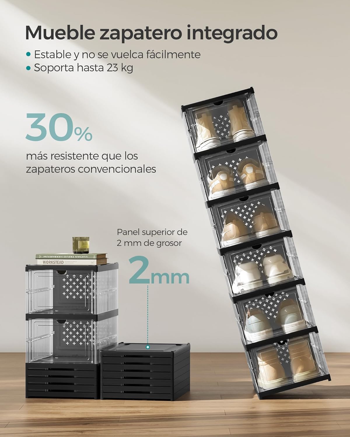 Eficacia organizadora: Cada contenedor puede contener zapatos de hasta la talla 46, manteniendo el polvo a raya. Encuentra el par que quieres ponerte con un simple vistazo, y abre la puerta delantera para cogerlo fácilmente para la ajetreada mañana de trabajo. Lo que es aún mejor es que estas cajas son apilables para el pasillo, el armario o una estantería.