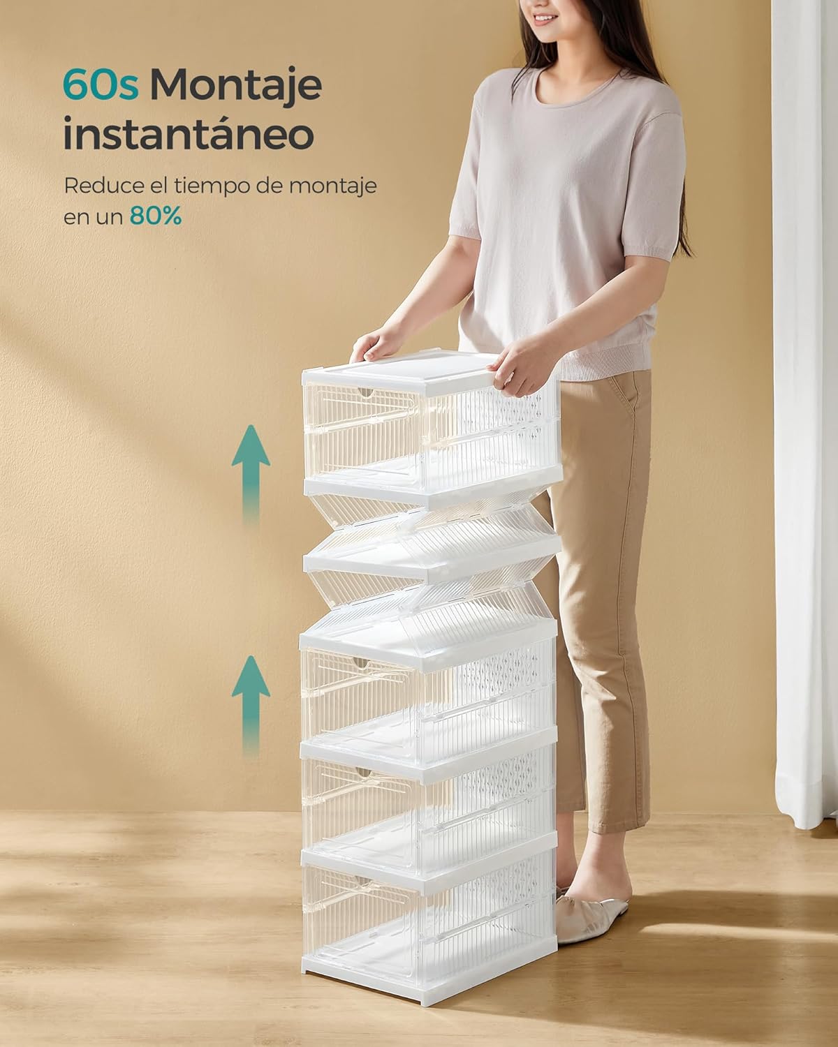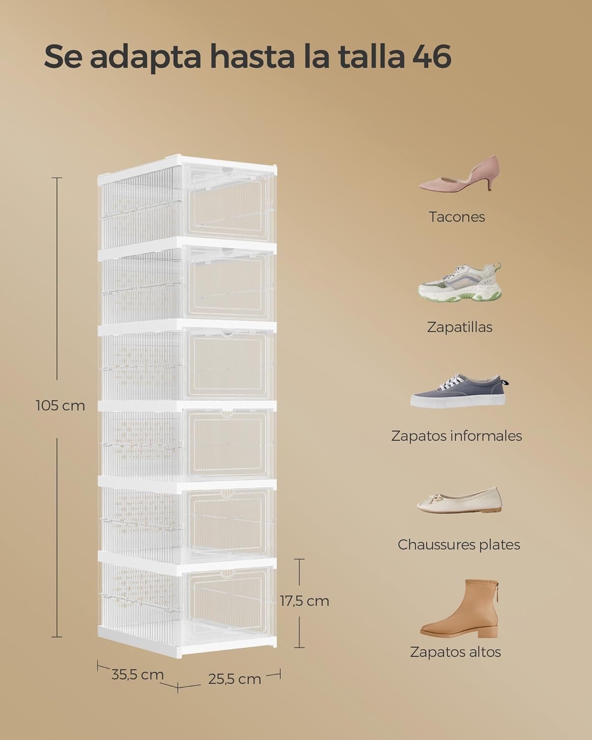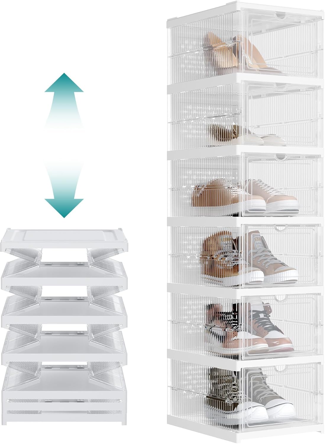 Eficacia organizadora: Cada contenedor puede contener zapatos de hasta la talla 46, manteniendo el polvo a raya. Encuentra el par que quieres ponerte con un simple vistazo, y abre la puerta delantera para cogerlo fácilmente para la ajetreada mañana de trabajo. Lo que es aún mejor es que estas cajas son apilables para el pasillo, el armario o una estantería.