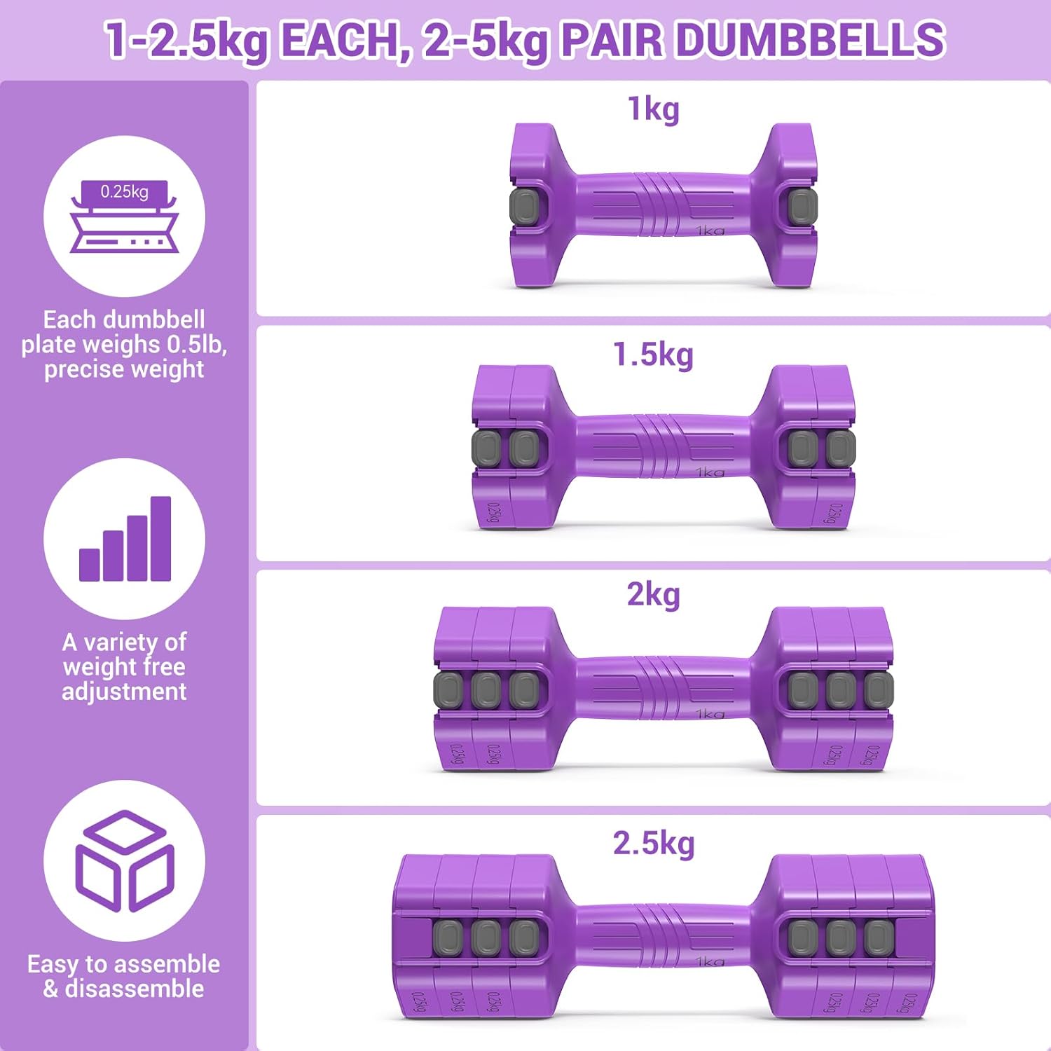 4-IN-1 ADJUSTABLE WEIGHTS – The Sportneer adjustable dumbbell pair features 6 weight plates of 0.25kg each. Each pair can be adjusted: 2kg (1kg x 2), 3kg (1.5kg x 2), 4kg (2kg x 2), 5kg (2.5kg x 2). We are the only adjustable dumbbells on the market with precise 0.25kg adjustments