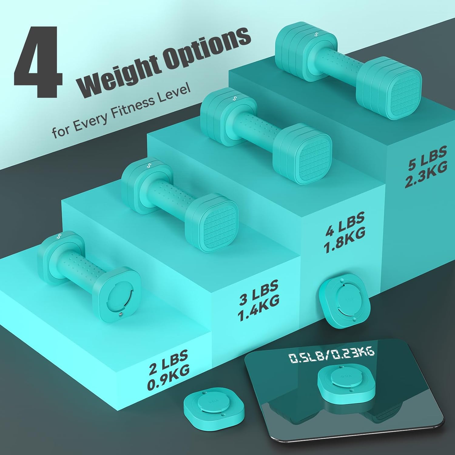 4-IN-1 ADJUSTABLE DUMBBELL PAIR – Each dumbbell includes six 0.5 lb weight plates, offering weight adjustment from 2 lbs to 5 lbs. Total pair weight is 9 pounds, ideal dumbbell set for women looking to start strength training or improve their home fitness routine with adjustable options