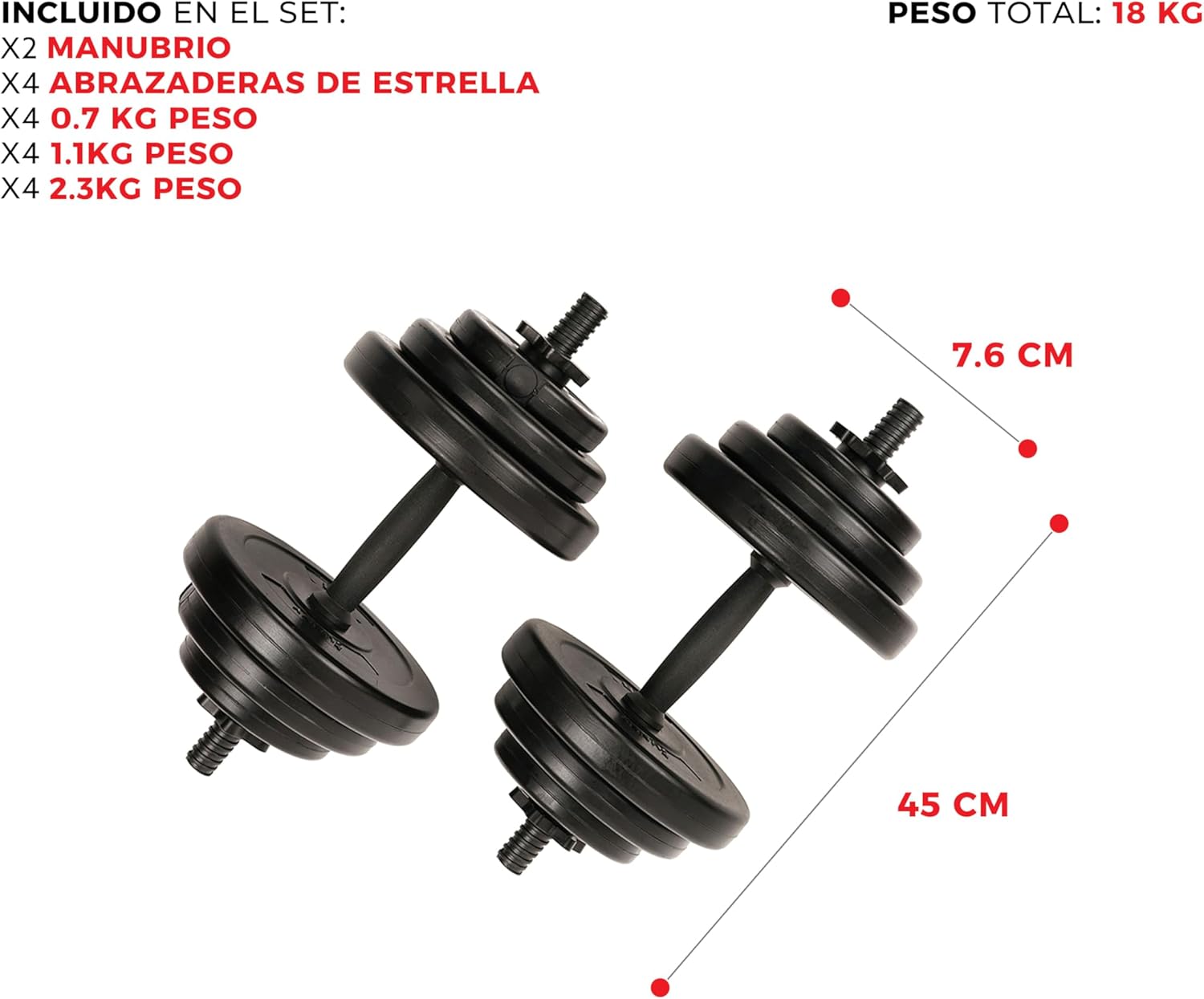 【18KG SET】Each set includes two adjustable dumbbells at 2kg, 5kg or 9kg each, with a combined total weight of 18kg.