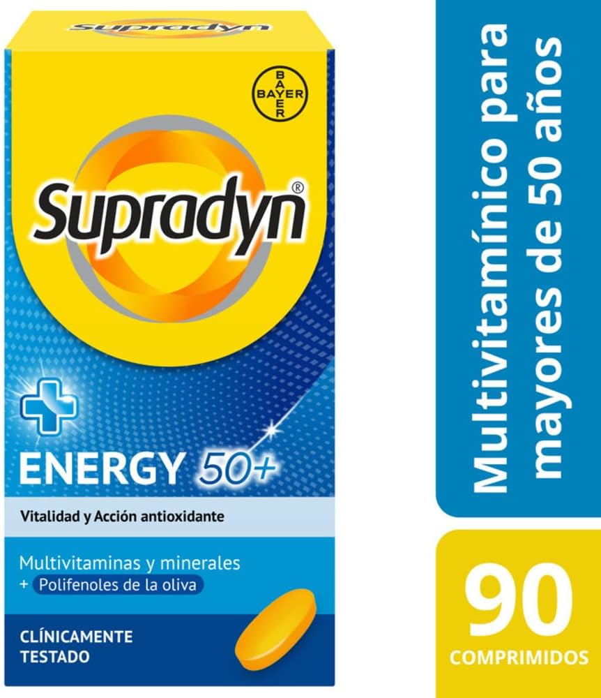 Product Description SUPRADYN ACTIVE 50+ – 90 tablets Supradyn Active 50+ is a unique and complete formula with vitamins, minerals and polyphenols from olive that, complementing your usual diet, helps maintain energy and vitality from 50 onwards, as well as protecting cells from oxidative damage. – 12 vitamins – 9 minerals – Antioxidants (Vitamin C, E, Zinc and Selenium): They contribute to the protection of cells against oxidative stress – Vitamins B1,B2,B6,B12: Contribute to normal energy metabolism Age: Adults 50+ Vitamins and minerals: 12 vitamins, 9 minerals and polyphenols of olive Effect: Aging Active (Energy with antioxidant action) Others: Sugar-free, lactose-free, gluten-free Why take it? Over the years, physical and mental vitality is reduced. A greater contribution of antioxidants and other nutrients will help maintain an active and energetic life. Supradyn Active 50+ is adapted to meet the needs of people over 50 who want to continue having an active life and maintain physical and mental vitality. How to take it? Take 1 tablet daily for breakfast for at least 6 weeks Ingredients Calcium carbonate; L-ascorbic acid; Volume agent: microcrystalline cellulose, maltodextrin; Magnesium oxide; DL-alpha-tocopheryl acetate; Anti-caking agent: Crosslinked sodium carboxymethylcellulose; Olive folhas extract eira; Nicotta inamide; Ferrous fumarate; Copper sulfate; Potassium iodet; Zinc oxide; Manganese sulfate; Sodium selenite; Sodium molybdate; Azeitone extrate; Calcium D-pantothenate; Pyridoxine chloride; Pteroylmonoglutâtâ acid mico; Cyanocobalt amine; D-biotin; Retinyl palmitate; Cholecalciferol; Thiamine mononitrate; Riboflavin; Anti-caking agents: silica dioxide, fat acid magnesium sais, talc; Coating agent: hydroxypropylmethylcellulose; Volume agent: polydextrose; Emulsifier: Cadet triglycerides eia media; Corporate before: ferro oxide, calcium carbonate. Address: The recommended dose is 1 tablet per day. Safety Warning The product is for adults and specifically recommended for ages 50+. Do not exceed the recommended daily dose. Do not use as a substitute for a balanced diet. It is recommended to follow a varied and balanced diet and a healthy lifestyle. Not recommended for children or pregnant or breastfeeding women. Keep out of reach of younger children. See More