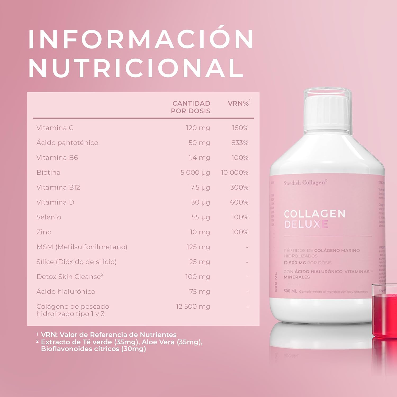 HIGH DOSE: Each serving contains a dose of 12,500 mg of Marine Collagen, Type 1 and 3, hydrolyzed in low molecular weight collagen for excellent absorption, enriched with 14 active ingredients such as Hyaluronic Acid, Biotin and Vitamin C