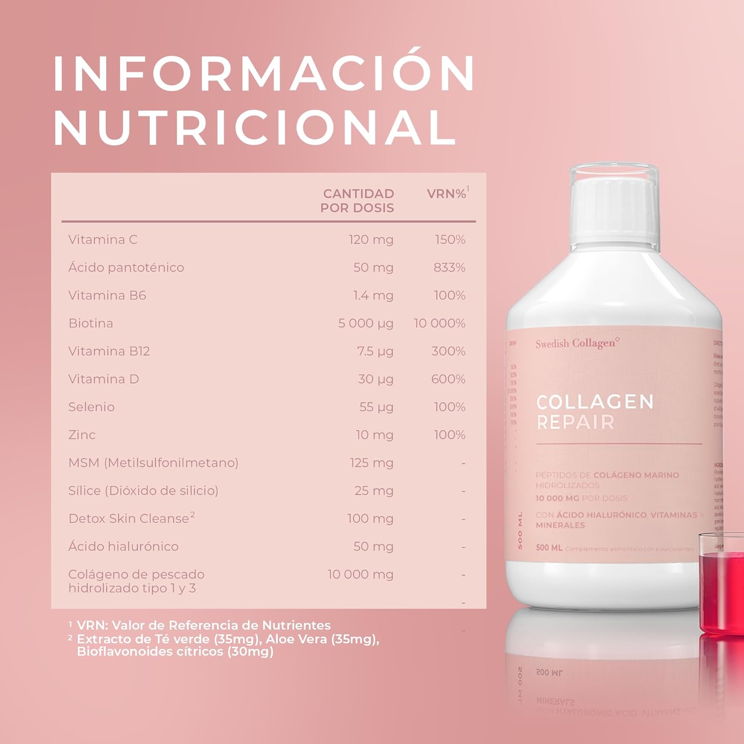 HIGH DOSE: Each serving contains a dose of 10,000 mg of Marine Collagen, Type 1 and 3, hydrolyzed in low molecular weight collagen for excellent absorption, enriched with active ingredients such as Hyaluronic Acid, Biotin and Vitamin C