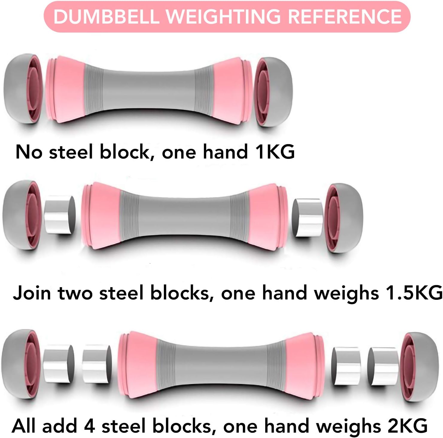 ✅ ADJUSTABLE WEIGHT: A single dumbbell without weight blocks weighs approximately 1 kg, a single dumbbell with 2 weight blocks weighs approximately 1.5 kg, a single dumbbell with 4 weight blocks weighs approximately 2 kg.
