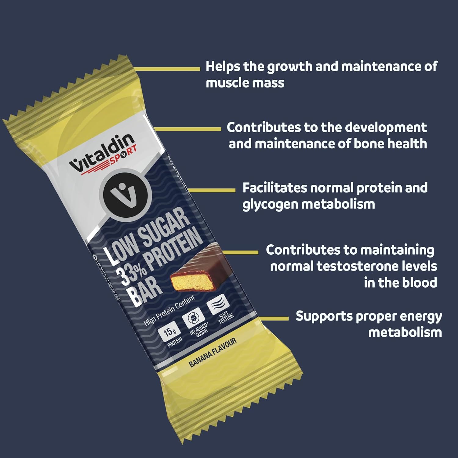 VITALDIN SPORT Low Sugar 33% Protein Bar Banana – 12 Protein Bars x 45g; Banana Flavor – High Protein Bar and Low Sugar – No Added Sugars