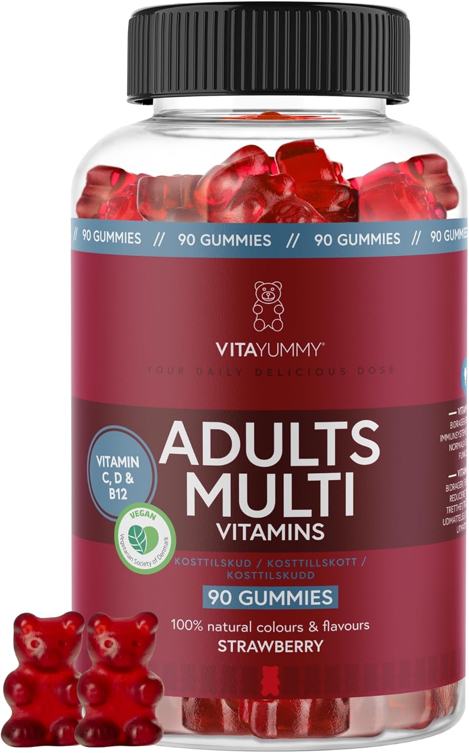 Multivitamin Gummy Bears – Our multivitamin gummy bears are a delicious addition to every day. With just two gummy bears a day, you will be provided with all the necessary vitamins and minerals. Vitayummy Adult multivitamins contain, among other things, vitamins A, D, E and B12, all contribute to the normal functioning of the immune system. NO ARTIFICIAL ADDITIVES – The product is free of artificial sweeteners, flavors and dyes. Vitayummy Adult Multivitamin Gummy Bears color comes from fruit and vegetable concentrates and the taste of natural flavors. The delicious taste comes from strawberries, and the natural color of Vitayummy Adults Multi comes from carrots and black currants. Vitayummy Vitamins are vegan and are perfect as an herbal supplement for your daily routine. Made in Germany. Quality is our top priority, which is why our products are made in Germany. Vitayummy se was developed in Denmark and we strive to achieve a high Scandinavian standard in our products.