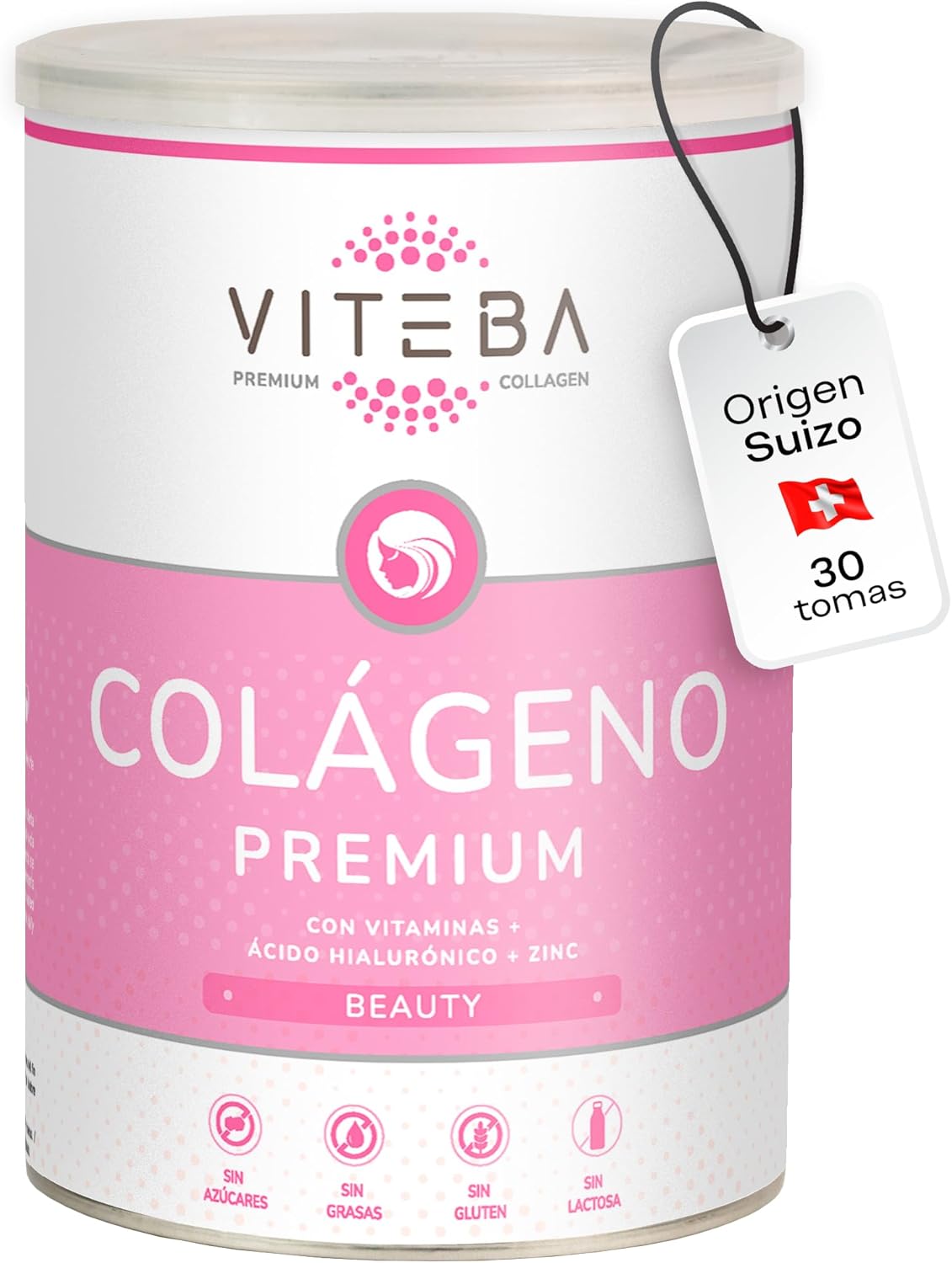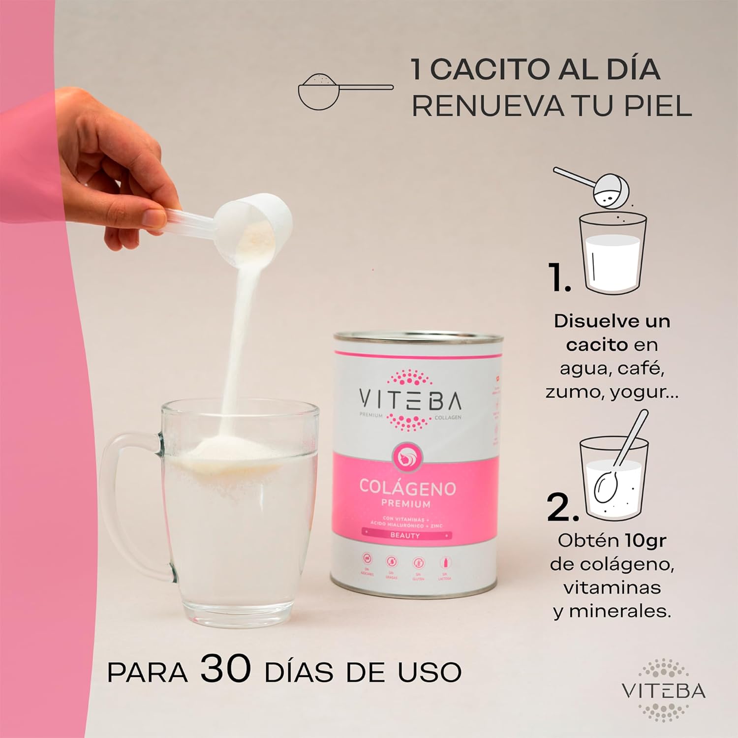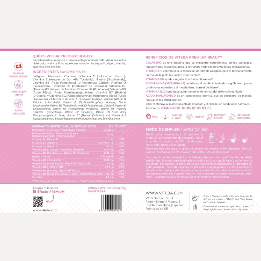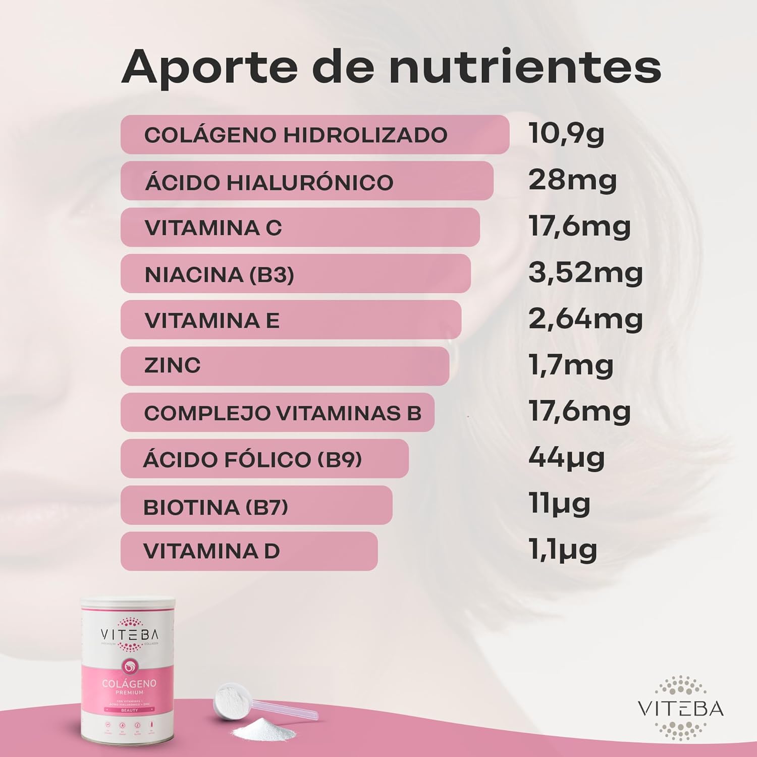 El Colágeno Viteba Beauty contiene en cada toma 10.9 g de Colágeno, además de Ácido Hialurónico, Zinc, Vitaminas B1, B5, B6, B7, B9 y B12, Riboflavina (B2), Niacina (B3), Vitaminas C, D y E.
