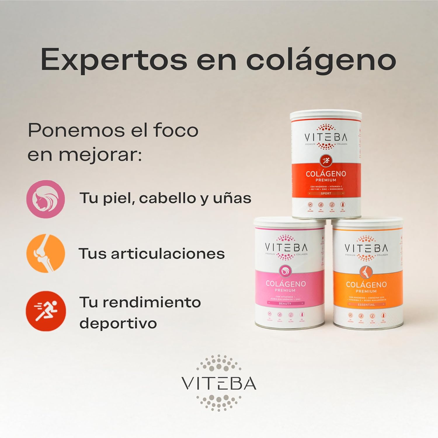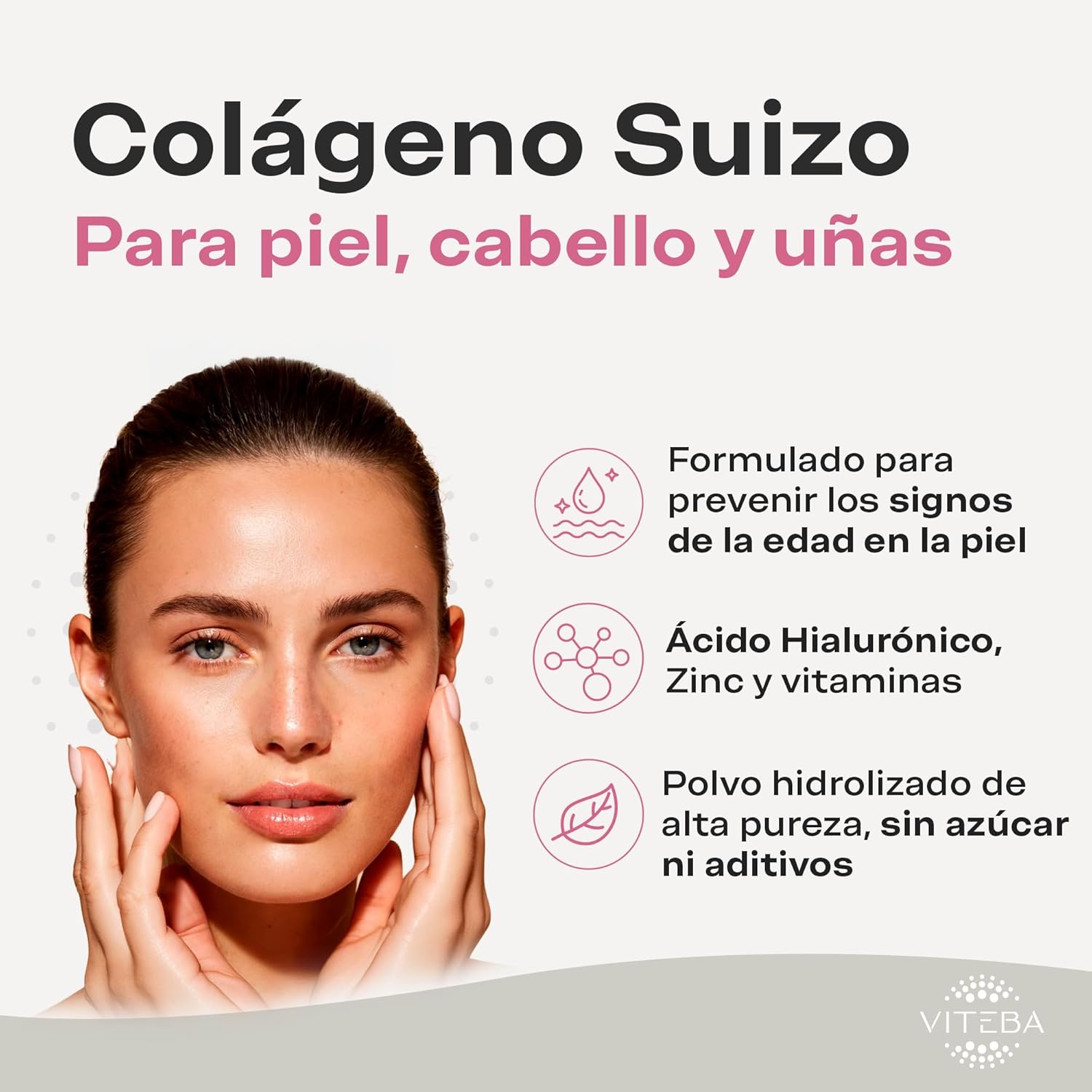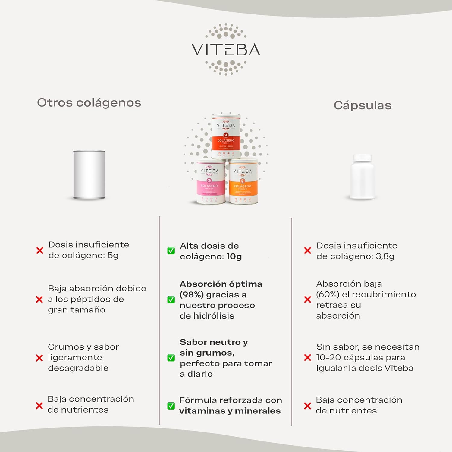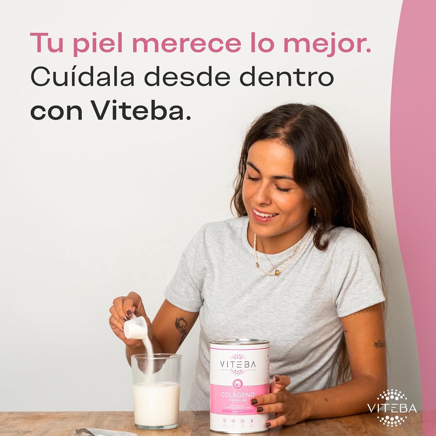El Colágeno Viteba Beauty contiene en cada toma 10.9 g de Colágeno, además de Ácido Hialurónico, Zinc, Vitaminas B1, B5, B6, B7, B9 y B12, Riboflavina (B2), Niacina (B3), Vitaminas C, D y E.