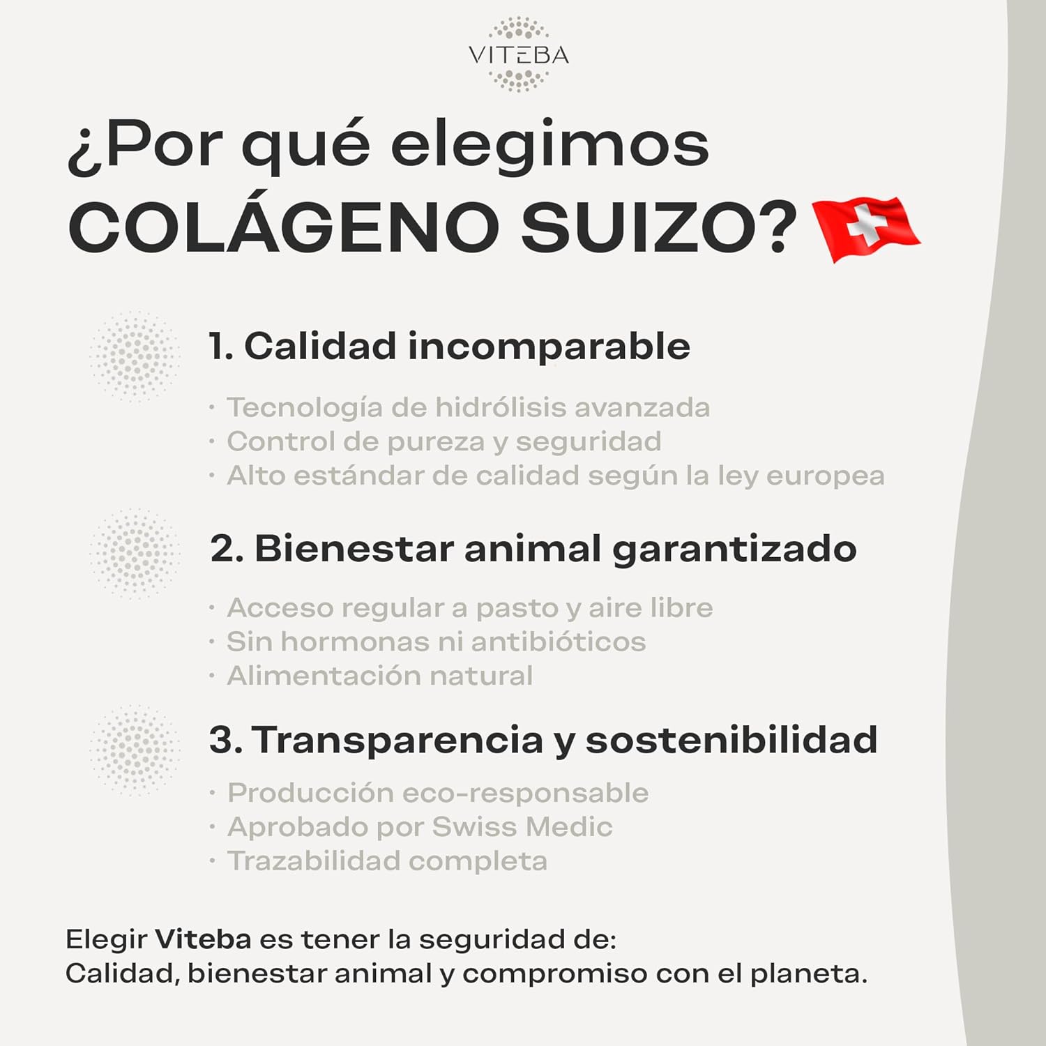 SUSTAINABLY ORIGINATED COLLAGEN – Sourced in Switzerland under strict sustainability, food safety and animal welfare regulations, Viteba offers you pure, high-quality collagen and 100% additive-free, gluten-free, lactose-free, fat-free, sugar-free or sweetener-free.
