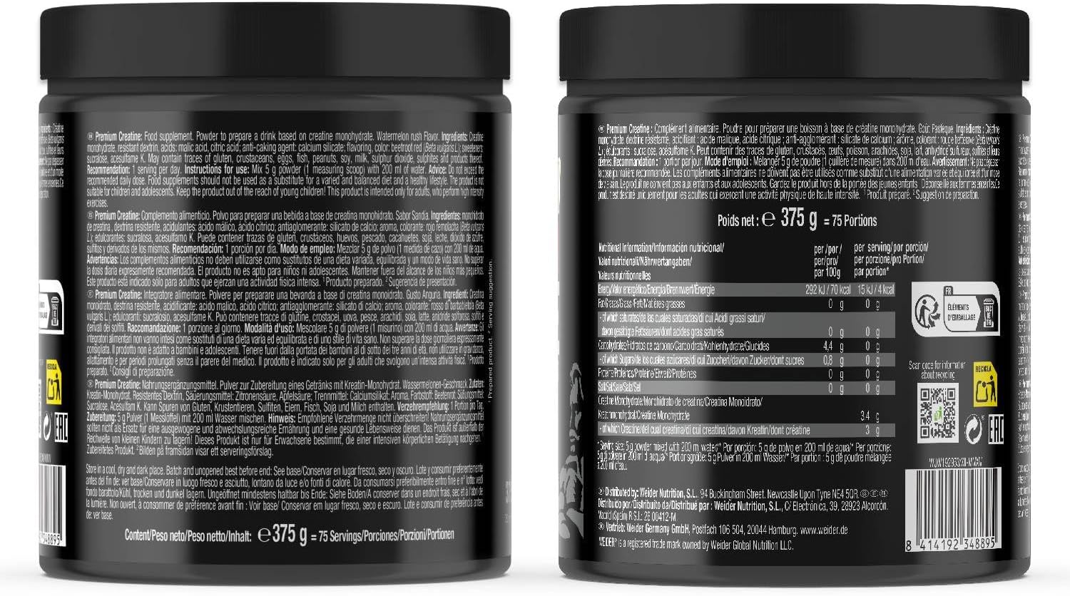 Weider Premium Creatine (375g) Watermelon Flavor, Creatine Monohydrate 100% Creapure, Sugar Free, Vegan, Physical Performance Increase (75 Servings)
