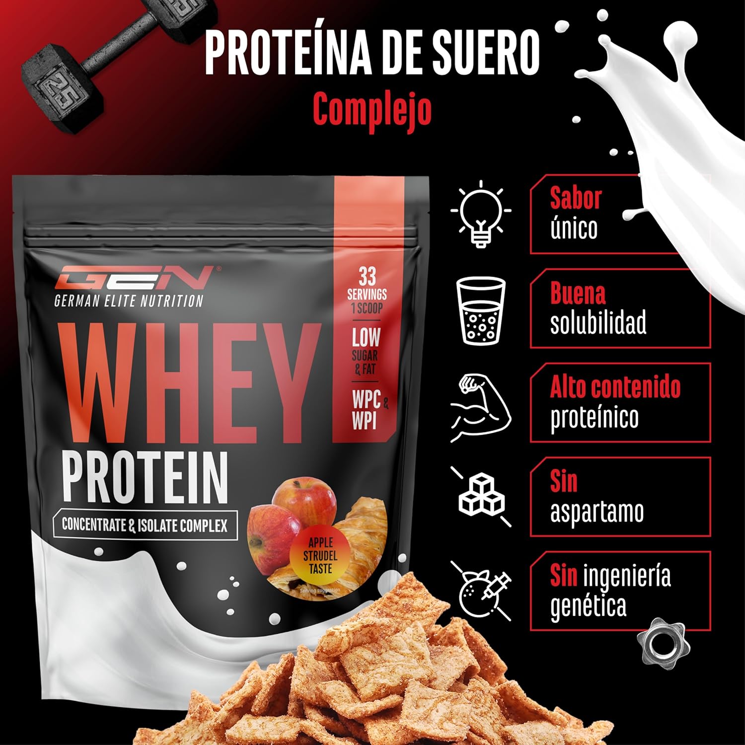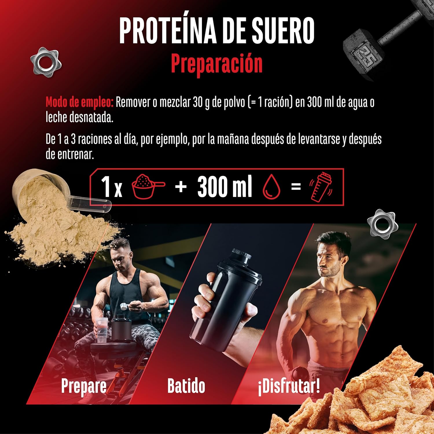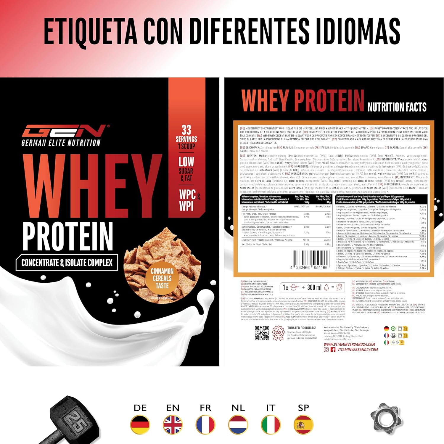 EASY TO USE: German Elite Nutrition whey dissolves perfectly in water or milk and can be easily dosed with the included scoop. Mix 30 g of powder (= 1 serving) in 300 ml of water or skimmed milk. 1 to 3 servings a day, for example in the morning when getting up and after training.