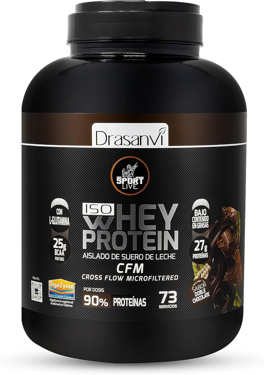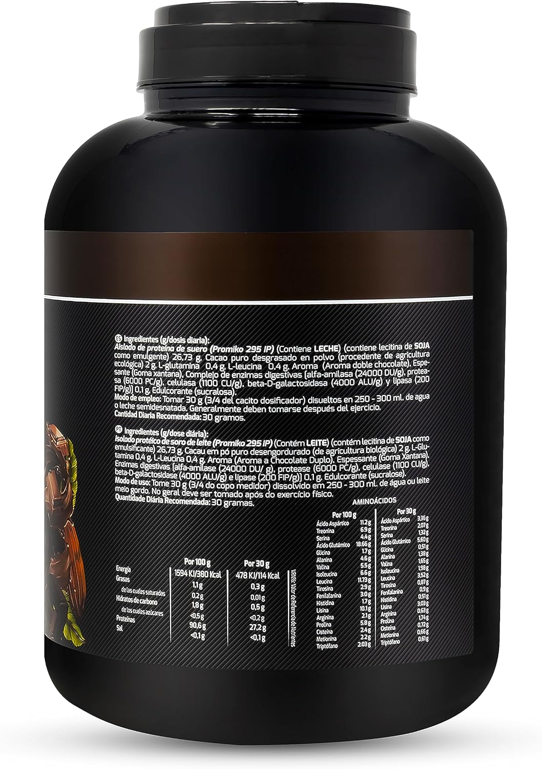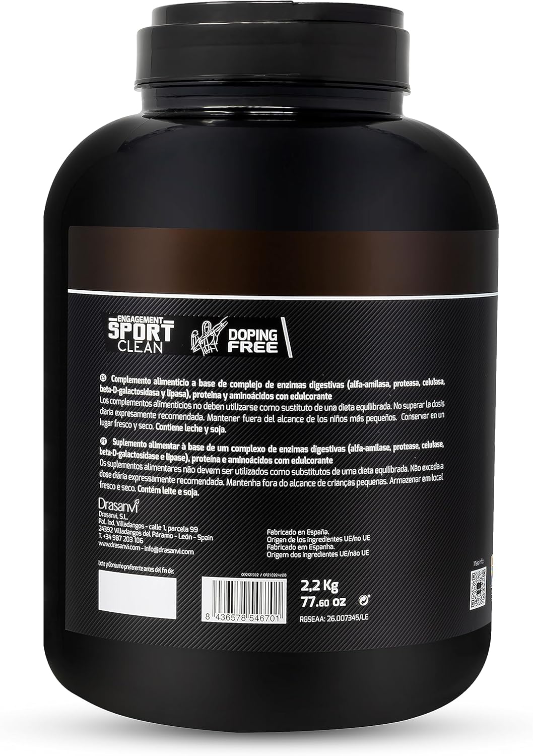 Discover Drasanvi’s delicious and nutritious double chocolate filtered whey protein in a 1600g container. This whey protein supplement is ideal for those looking to increase their muscle mass and improve their athletic performance. Thanks to its advanced formula, this protein powder is perfect for complementing your workouts and helping you reach your fitness goals. Whey protein is known to be one of the best sources of protein for muscle growth. With Drasanvi’s isolated protein, you will get a high-quality smoothie, which will provide you with all the essential amino acids needed for optimal muscle recovery and development. Plus, its delicious double chocolate flavor will make you enjoy every smoothie. Don’t wait any longer and start experiencing the benefits of protein for muscle mass with this amazing product. Food supplement based on complex of digestive enzymes (alpha-amylase, protease, cellulase, beta-D-galactosidase and lipase) protein and amino acids with sweetener.