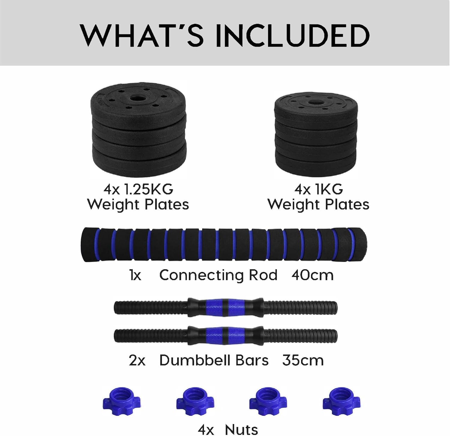 Box contents: 30 kg set: 2 x dumbbell bars, 4 x locking nuts, 1 x dumbbell connection bar, 4 x 2.5 kg dumbbells, 4 x 2 kg dumbbells, 4 x 1.5 kg dumbbells, 4 x 1.25 kg dumbbells.
