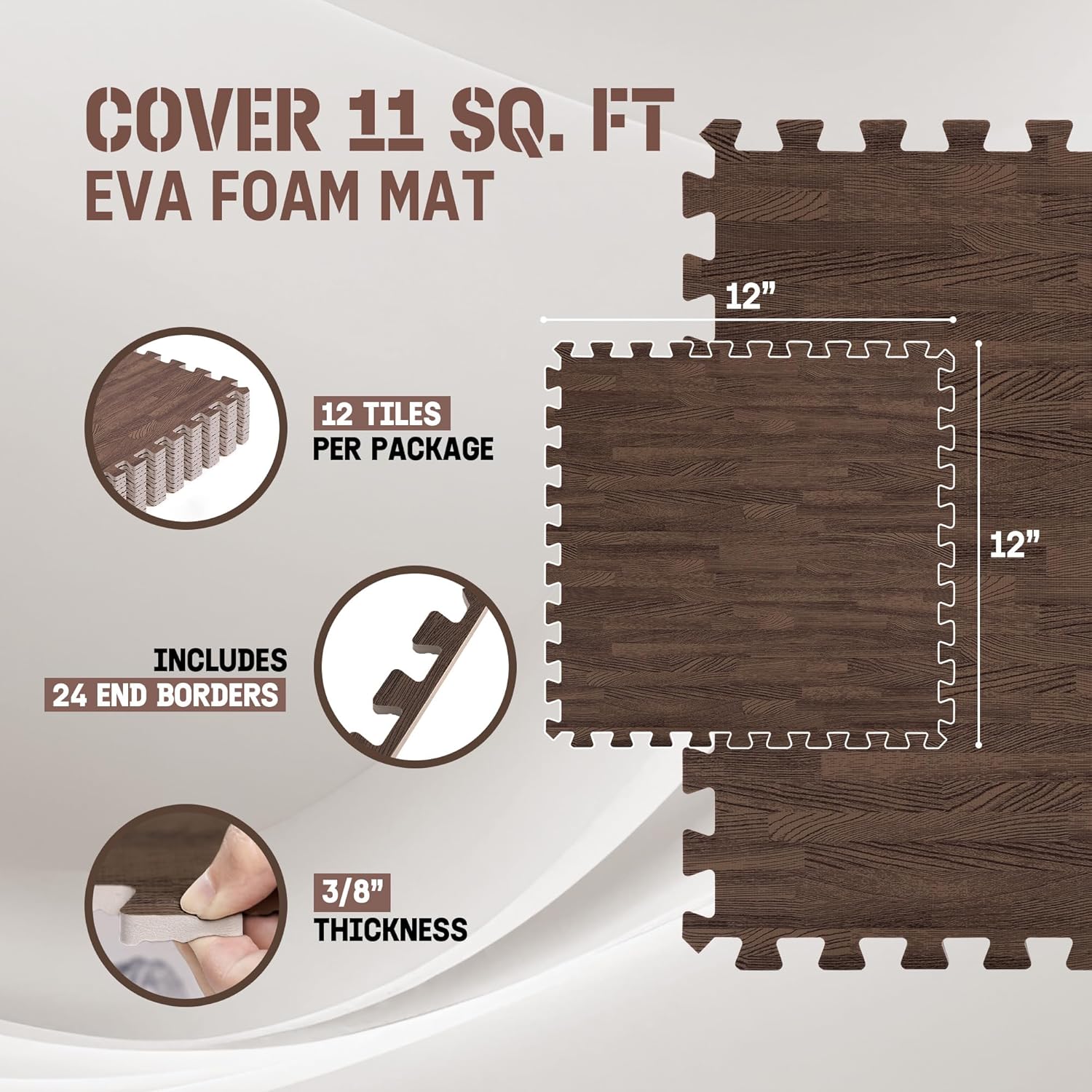 Covers 12 square feet. Feet: includes 12 tiles. Each tile measures 12″ L x 12″ W x 0. 38 inches thick. thick from the highest point of the texture. You can get creative with the tiles and make mat patterns of your choice