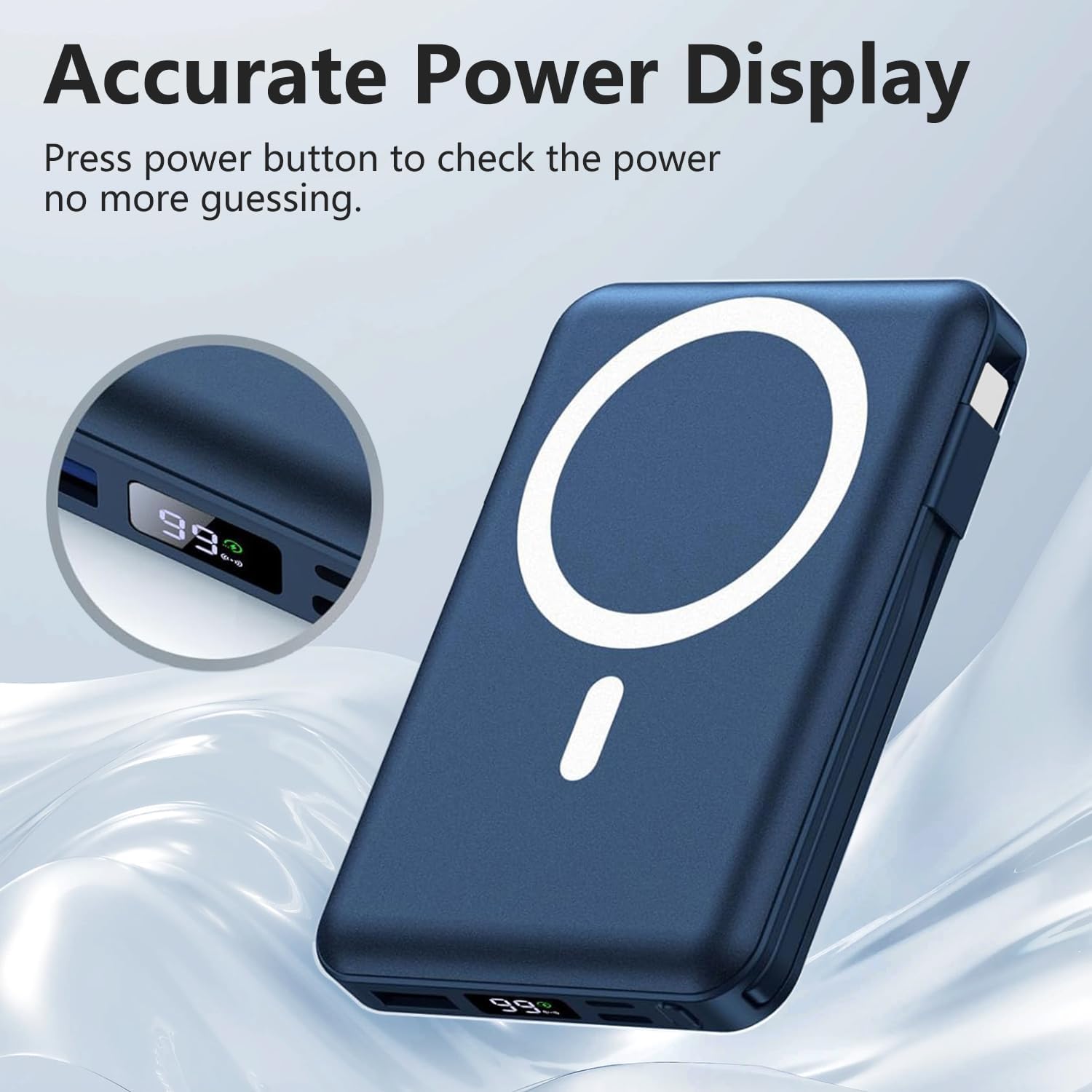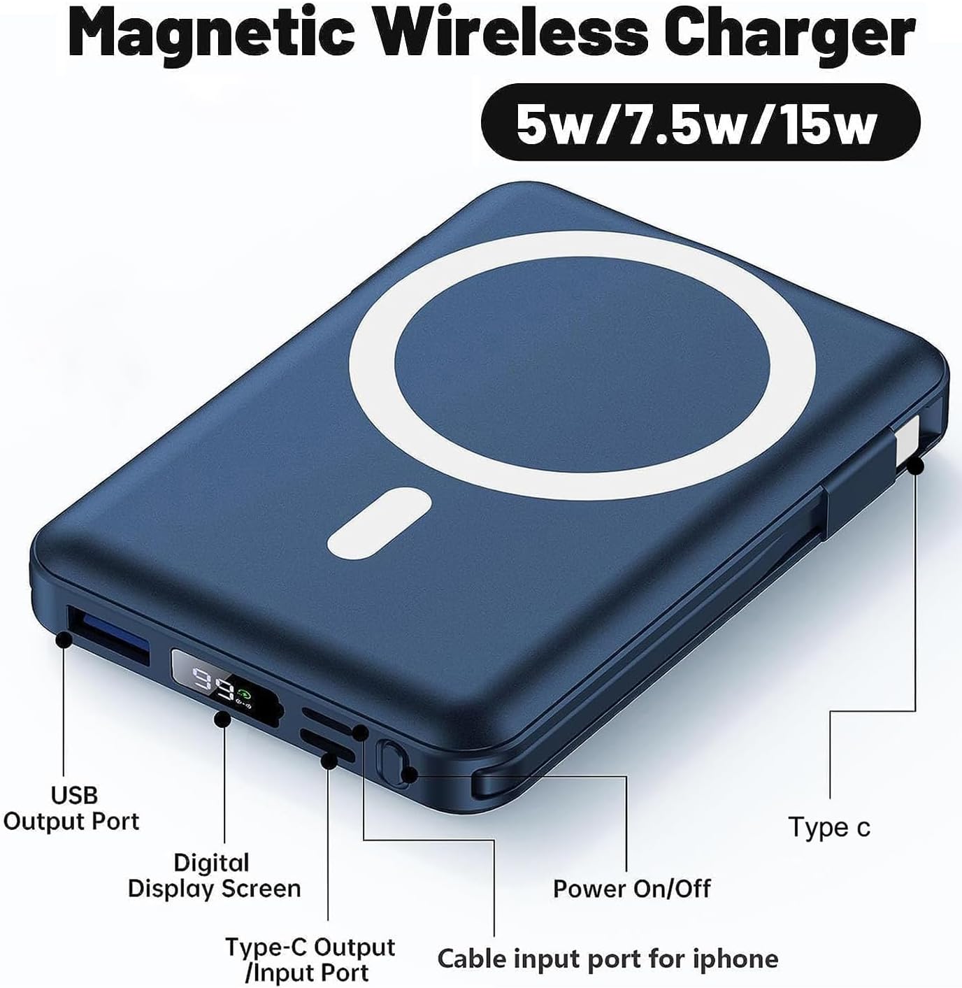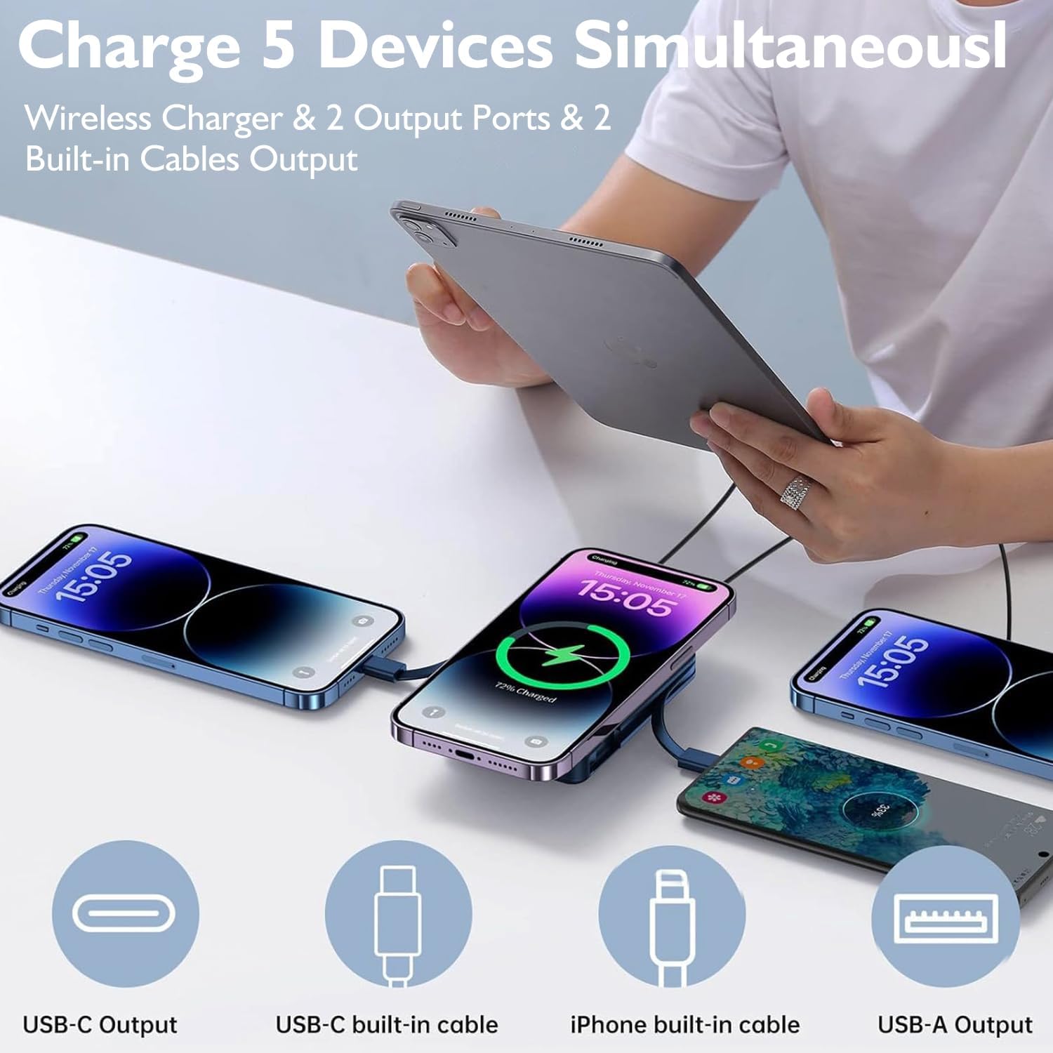 Charging for 5 Devices Simultaneously: This magnetic portable battery comes with built-in Lighting and Type-C charging cables, perfectly compatible with iPhone or Type-C devices without the need to carry additional cables. Equipped with 4 outputs and 15W wireless charging. wireless charging 20W PD USB-C22.5W QC USB-A. Magnetic wireless power bank can charge 5 devices at the same time effectively meeting the charging needs of multiple devices