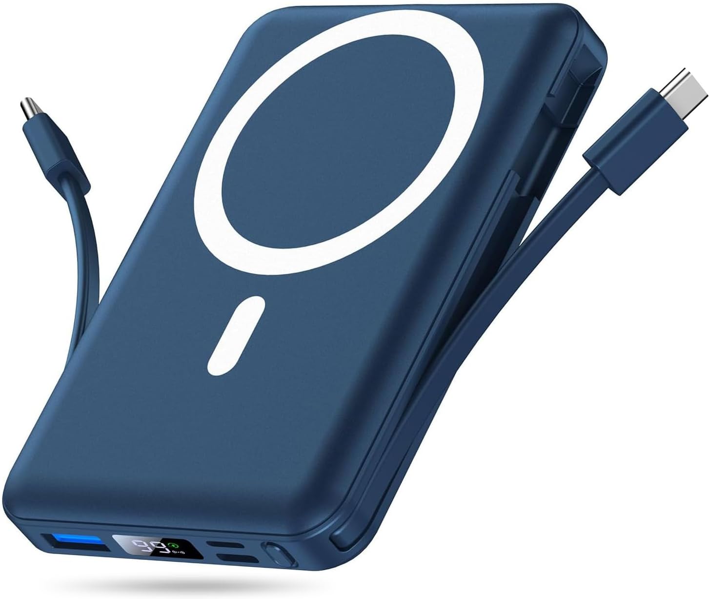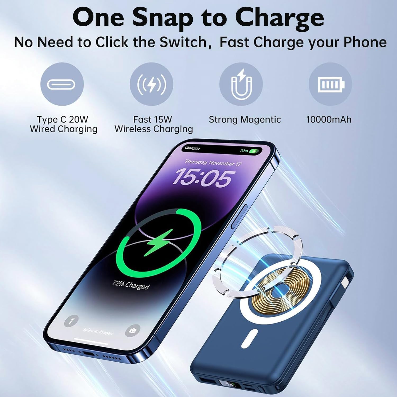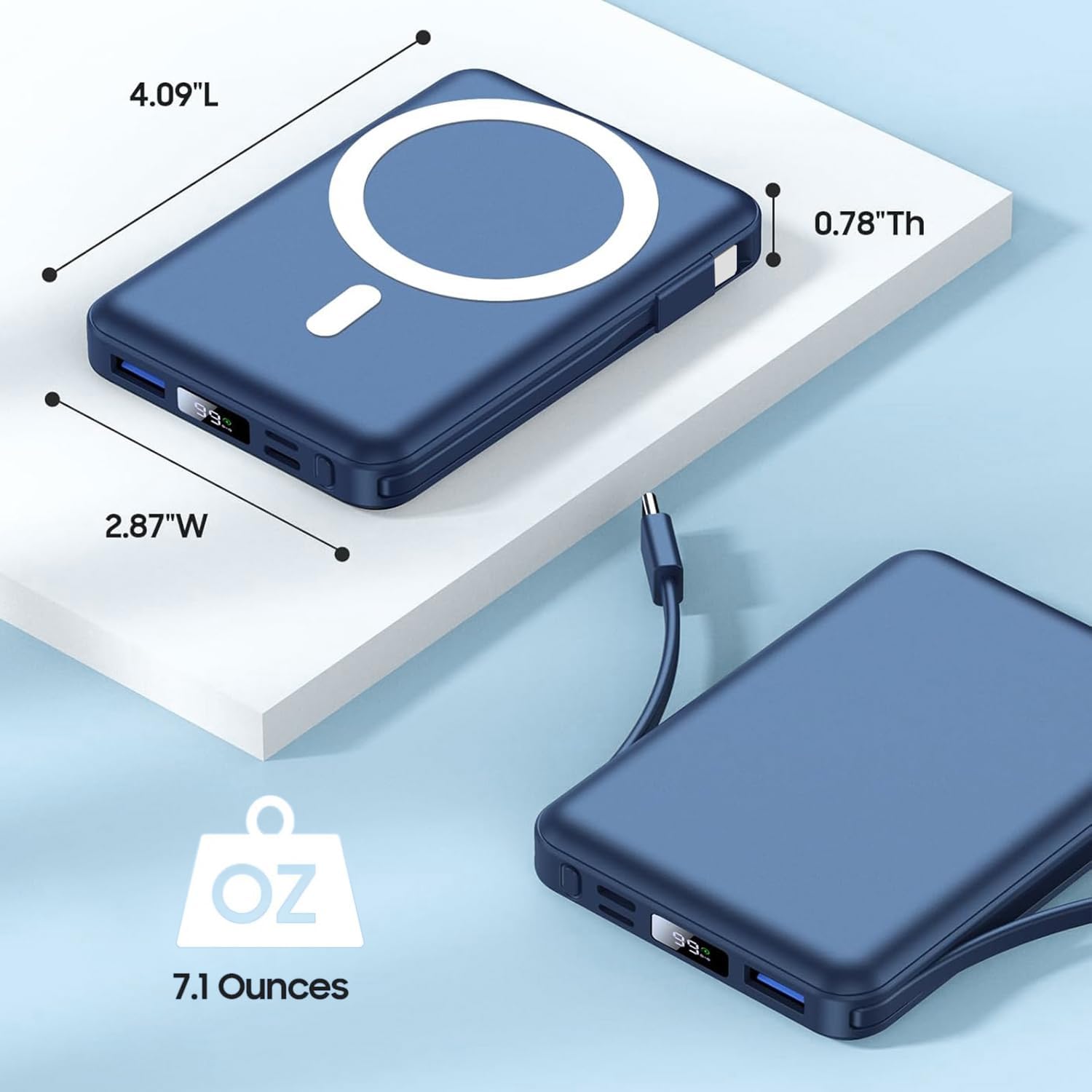 Charging for 5 Devices Simultaneously: This magnetic portable battery comes with built-in Lighting and Type-C charging cables, perfectly compatible with iPhone or Type-C devices without the need to carry additional cables. Equipped with 4 outputs and 15W wireless charging. wireless charging 20W PD USB-C22.5W QC USB-A. Magnetic wireless power bank can charge 5 devices at the same time effectively meeting the charging needs of multiple devices