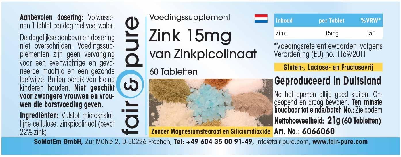 For your health: Zinc 15 mg (elemental content) zinc picolinate, vegan, highly dosed, 60 zinc tablets. The product contains no gluten, fructose, lactose, magnesium stearate, silicon dioxide, dyes, flavorings and preservatives.