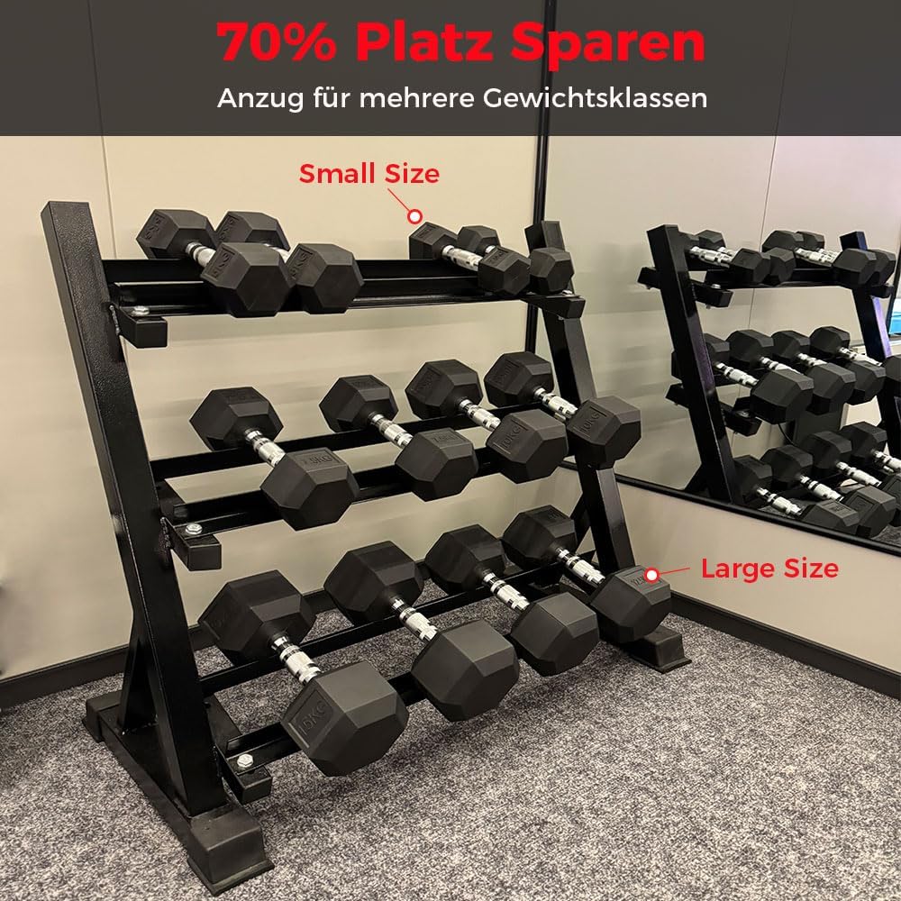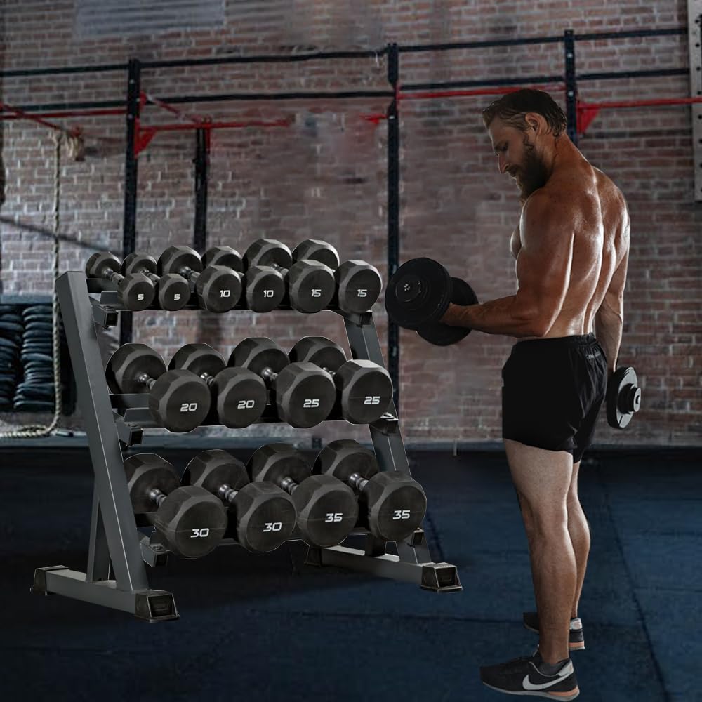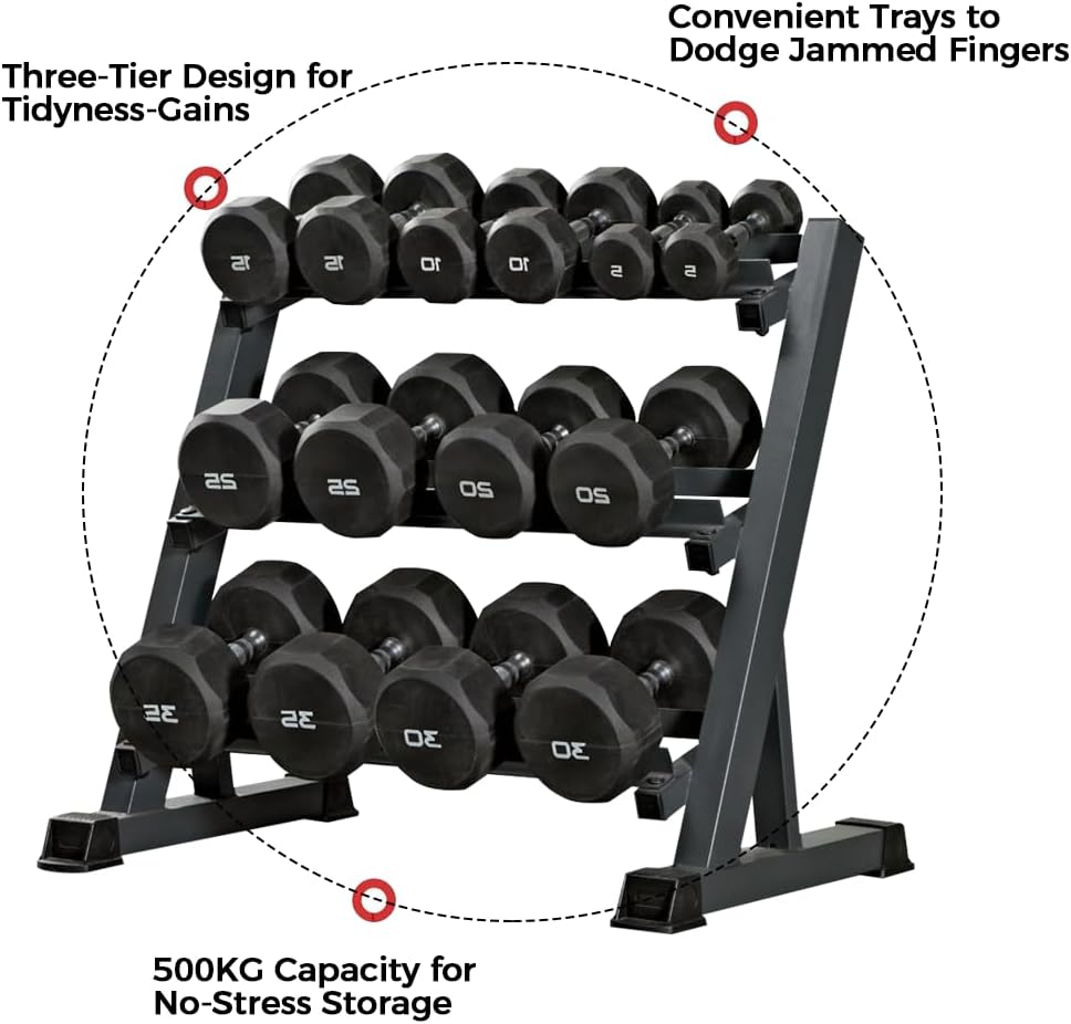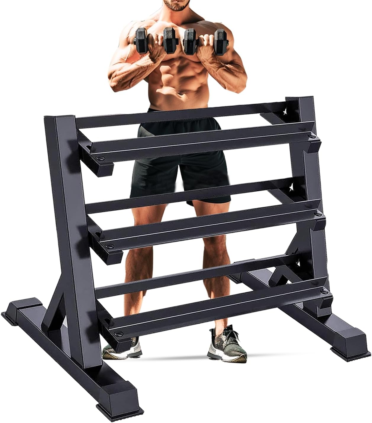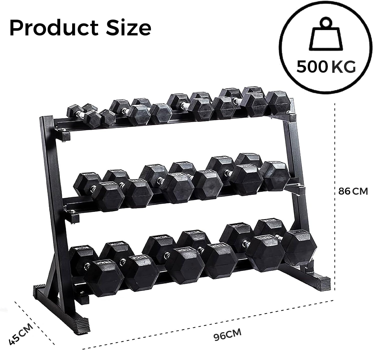 [Space-saving design] It offers you the same benefit as a 2-tier weight rack with a much smaller base surface without compromising storage capacity. The 3 x 1.2m shelves offer space for a larger number of dumbbells than standard 2-tier designs.